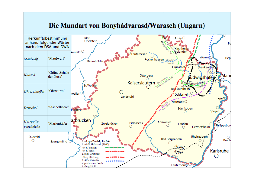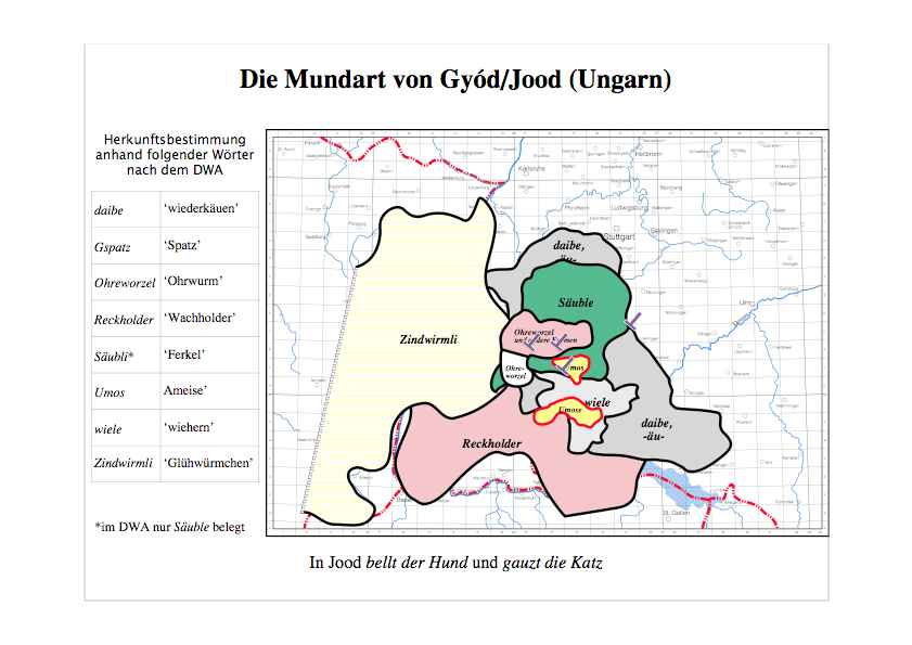 Für die Herkunftsbestimmung werden nur Wörter der jeweiligen Ortsmundart verwendet, deren exakte Entsprechungen im Binnendeutschen einmalig sind und in einem kleinen Gebiet vorkommen. Die Mundart von Bonyhádvarasd/Warasch erweist sich anhand der hier herangezogenen Wörter und vieler weiterer Mekmale als Mundart der nördlichen Vorderpfalz, die Mundart von Gyód/Jood als alemannische Mundart aus der Region um Rottweil und der Donauquellen.